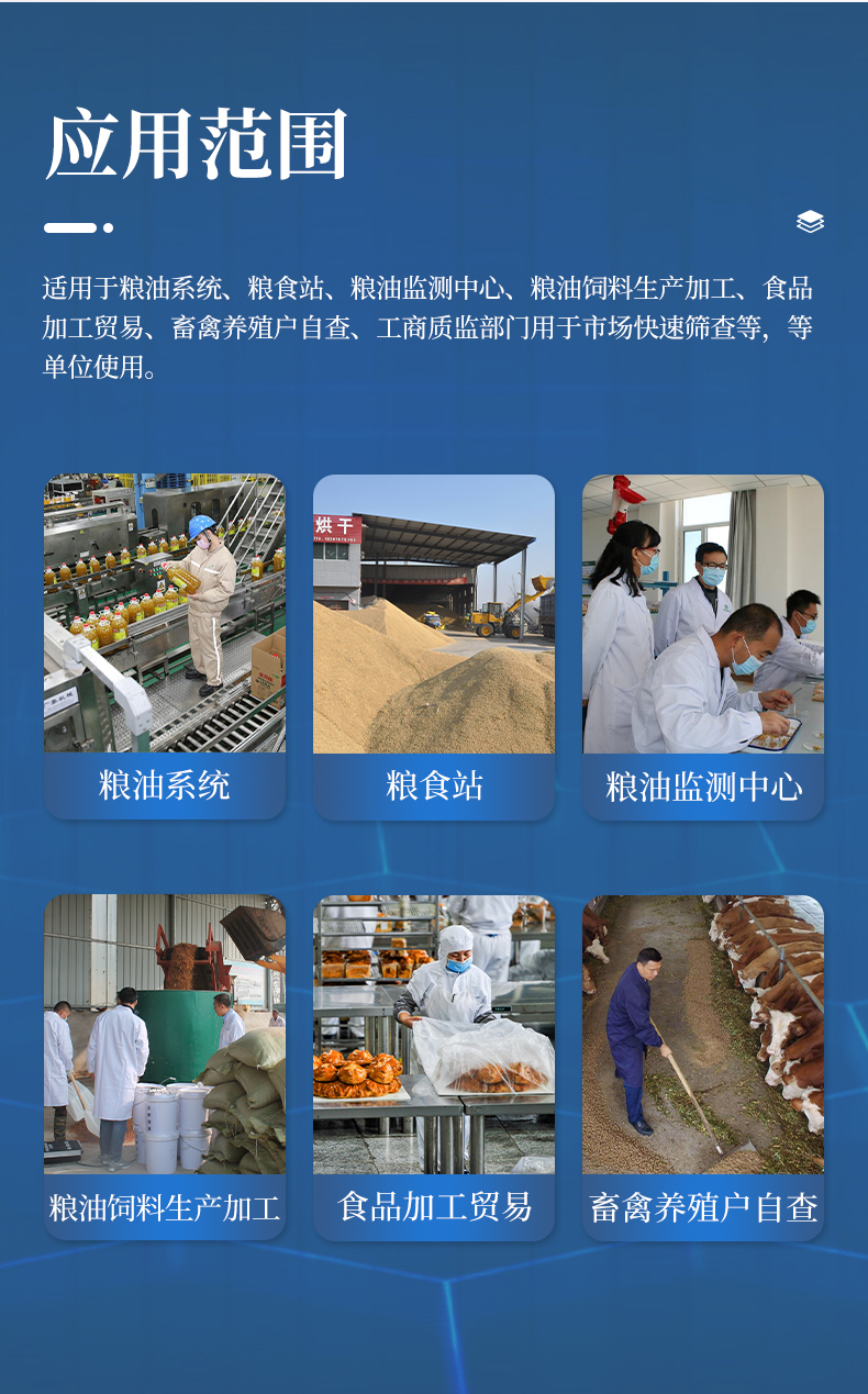 該真菌毒素檢測(cè)儀為集成化快速檢測(cè)分析設(shè)備,適用于糧油系統(tǒng)、糧食站、糧油監(jiān)測(cè)中心、糧油飼料生產(chǎn)加工、食品加工貿(mào)易、畜禽養(yǎng)殖戶自查、工商質(zhì)監(jiān)部門用于市場(chǎng)快速篩查等,等單位使用。