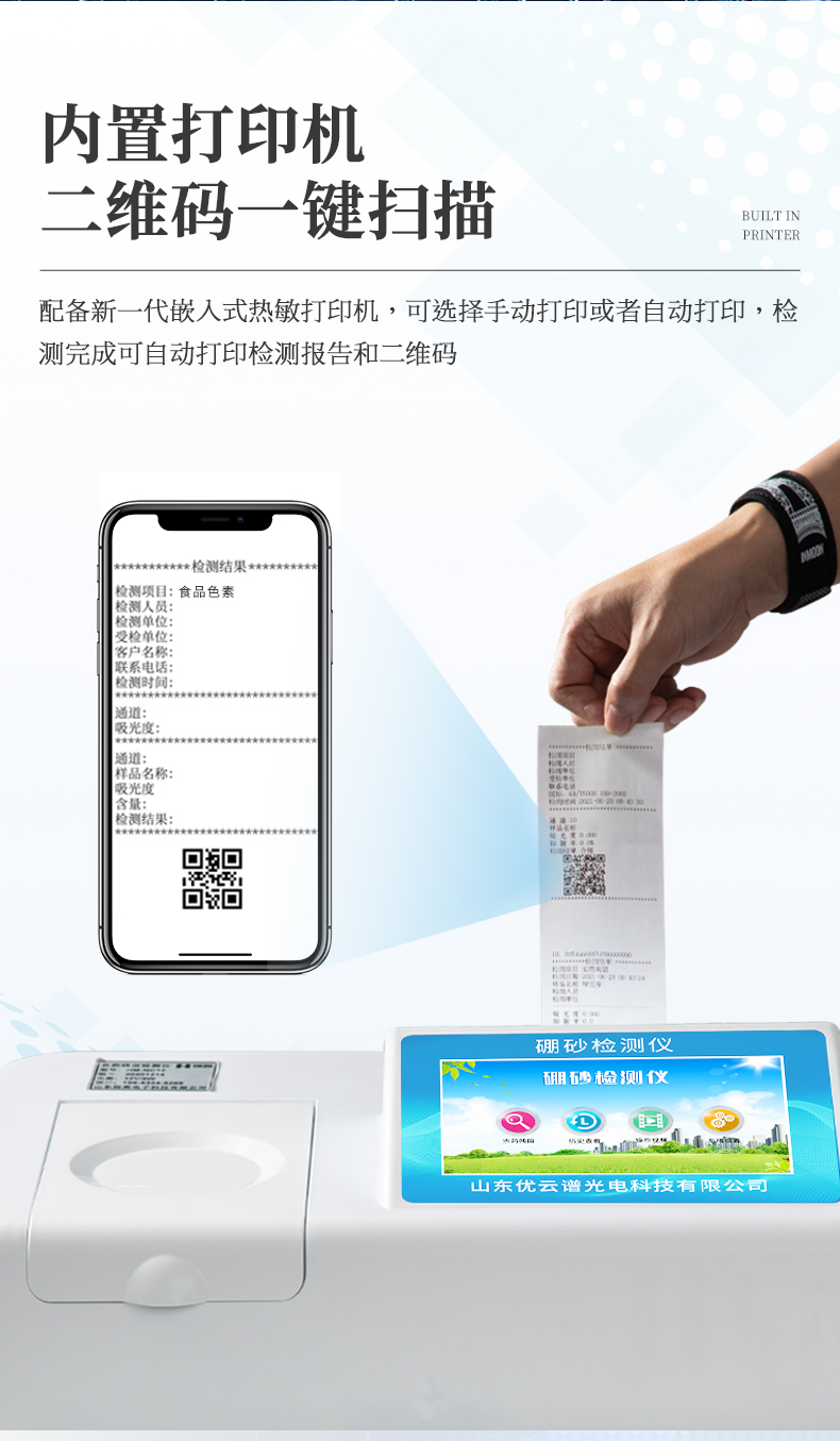 5、配備新一代嵌入式熱敏打印機,可選擇手動打印或者自動打印,檢測完成可自動打印檢測報告和二維碼。