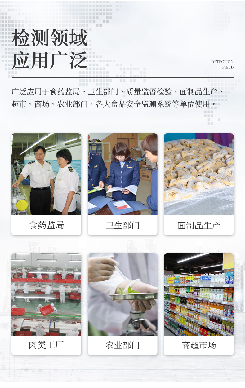 該多功能YP-P12硼砂檢測儀為集成化食品安全快速檢測分析設(shè)備,廣泛應(yīng)用于食藥監(jiān)局、衛(wèi)生部門、質(zhì)量監(jiān)督檢驗、面制品生產(chǎn)基地、超市、商場、農(nóng)業(yè)部門、食品肉產(chǎn)品深加工企業(yè)、各大食品安全監(jiān)測系統(tǒng)等單位使用。