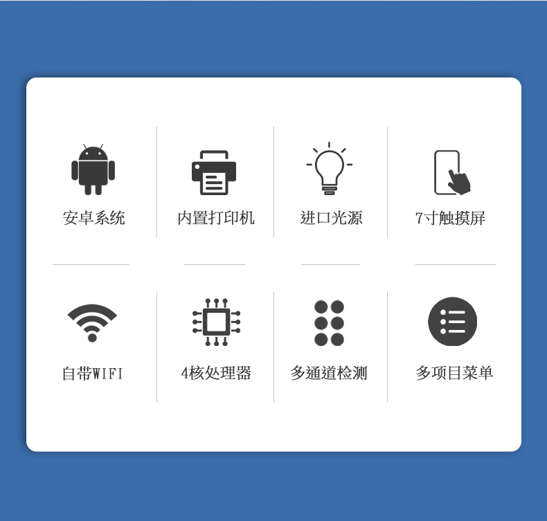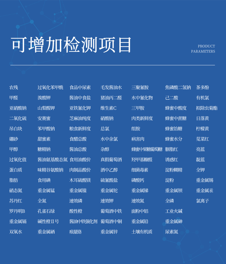 7、具有多個(gè)食品安全檢測(cè)項(xiàng)目,開(kāi)放平臺(tái),可以增減檢測(cè)項(xiàng)目。