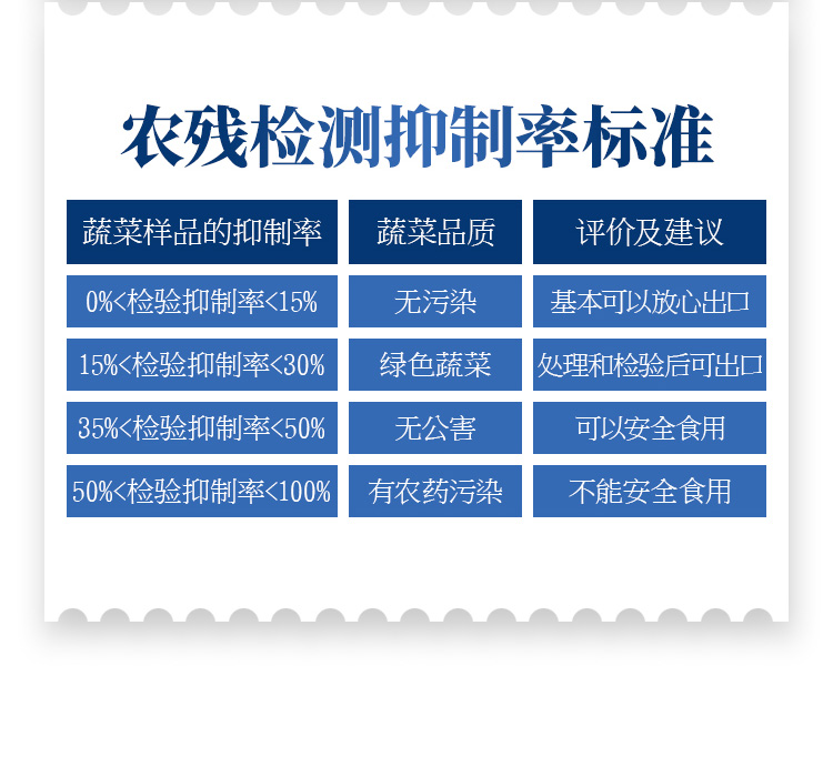 檢測(cè)標(biāo)準(zhǔn):依據(jù)國(guó)家標(biāo)準(zhǔn)方法(GB/T5009.199-2003)以及世界衛(wèi)生組織WHO、世界糧農(nóng)組織FAO殘留農(nóng)藥檢測(cè)標(biāo)準(zhǔn)、世界環(huán)境保護(hù)局EPA參照攝入量等要求來設(shè)計(jì)。采用酶抑制率比色法對(duì)水果、蔬菜等農(nóng)林產(chǎn)品中有機(jī)磷和氨基甲酸酯類農(nóng)藥含量進(jìn)行快速準(zhǔn)確的檢測(cè)。